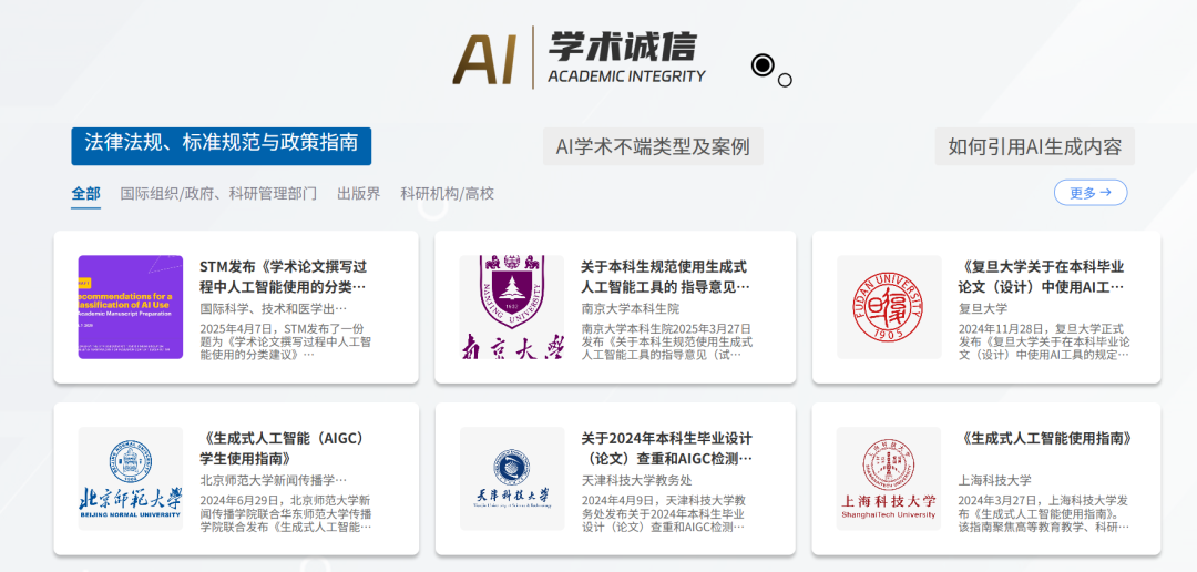 平台结合AI工具与应用、学术诚信、隐私安全等核心问题,全面梳理国内外权威机构制定的AI相关法规、政策与标准,精心挑选国内外常见AI工具与应用,列举AI伦理与隐私安全相关的关键事项,并推荐AI学习资源。
