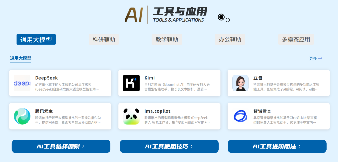 为应对智能时代的教育变革,积极推动人工智能赋能教育强国建设,图书馆建成“生成式人工智能专题指南”,致力于解决资源整合难题,通过构建系统化学习平台,满足我校师生在学习、科研、工作等多场景下有效运用AI技术的现实需求。
